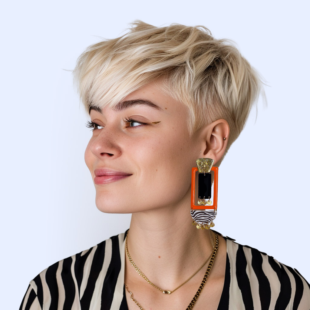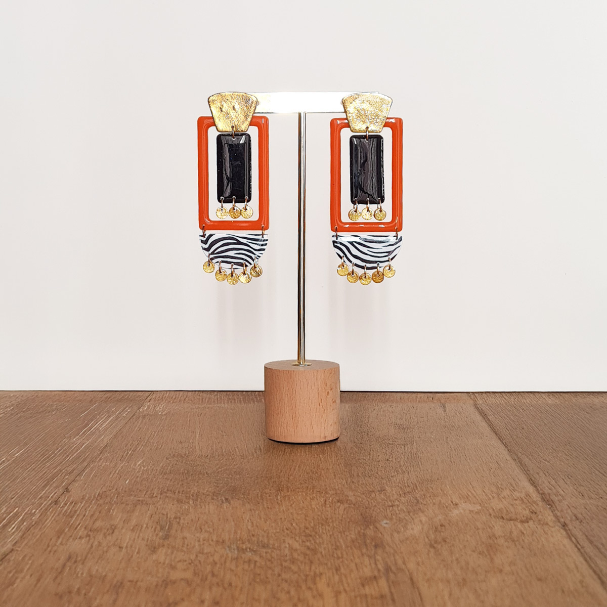 Un modèle imposant, pensé comme une composition graphique : un cadre, un rectangle suspendu, un demi-cercle, des pampilles rondes… Chaque élément joue avec les volumes, les formes et les matières pour créer un bijou structuré, vivant, en mouvement.